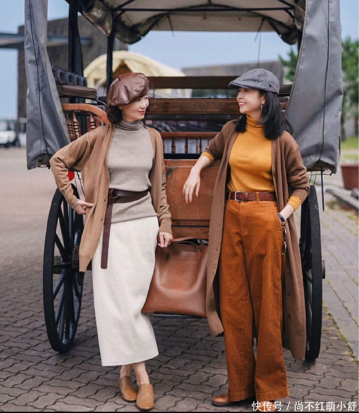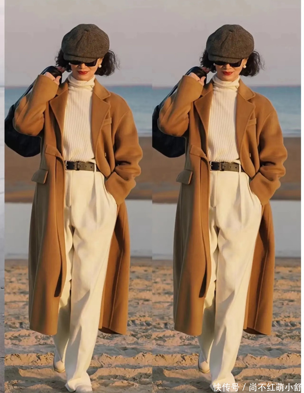 三木妈妈的草编帽永远比脸大一圈,帽檐往下压1厘米,显脸小还遮白发;还有贝雷帽,深咖色配同色系大衣,复古又洋气。记住“帽子颜色和衣服呼应”,比如穿黑色大衣就戴黑色帽子,整体协调得像定制款。